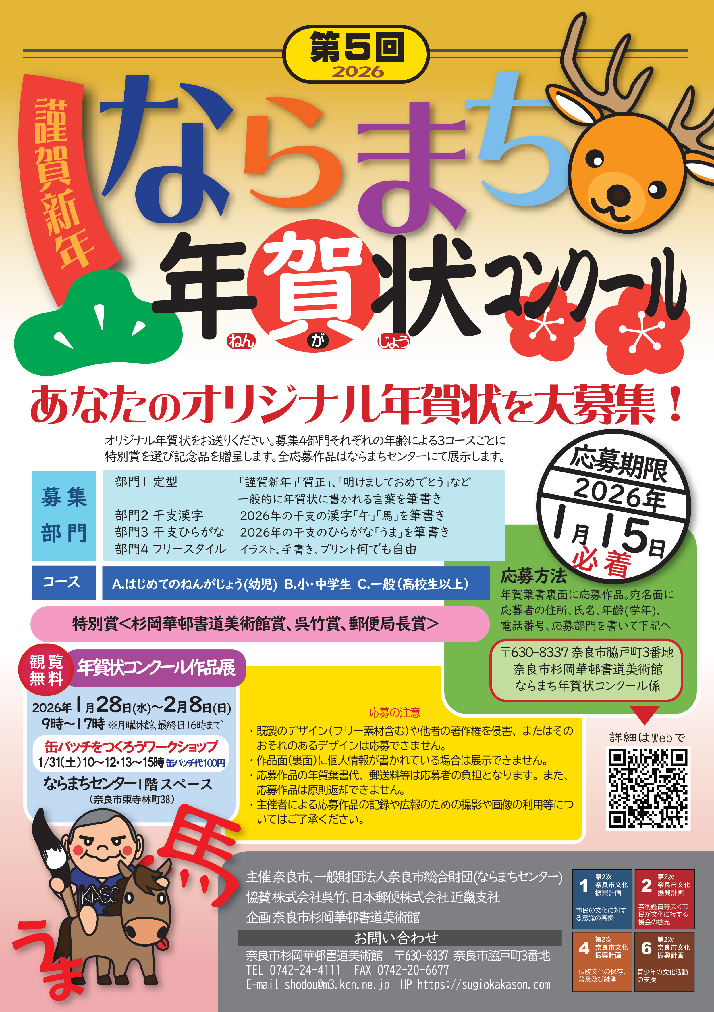 | 応募方法 | 年賀葉書裏面に応募作品、宛名面に応募者の住所・氏名・年齢(学年)、電話番号、応募部門を書いて下記へお送りください。≪2026年1月15日必着≫ 〒630-8337 奈良市脇戸町3番地 奈良市杉岡華邨書道美術館 ならまち年賀状コンクール係 |