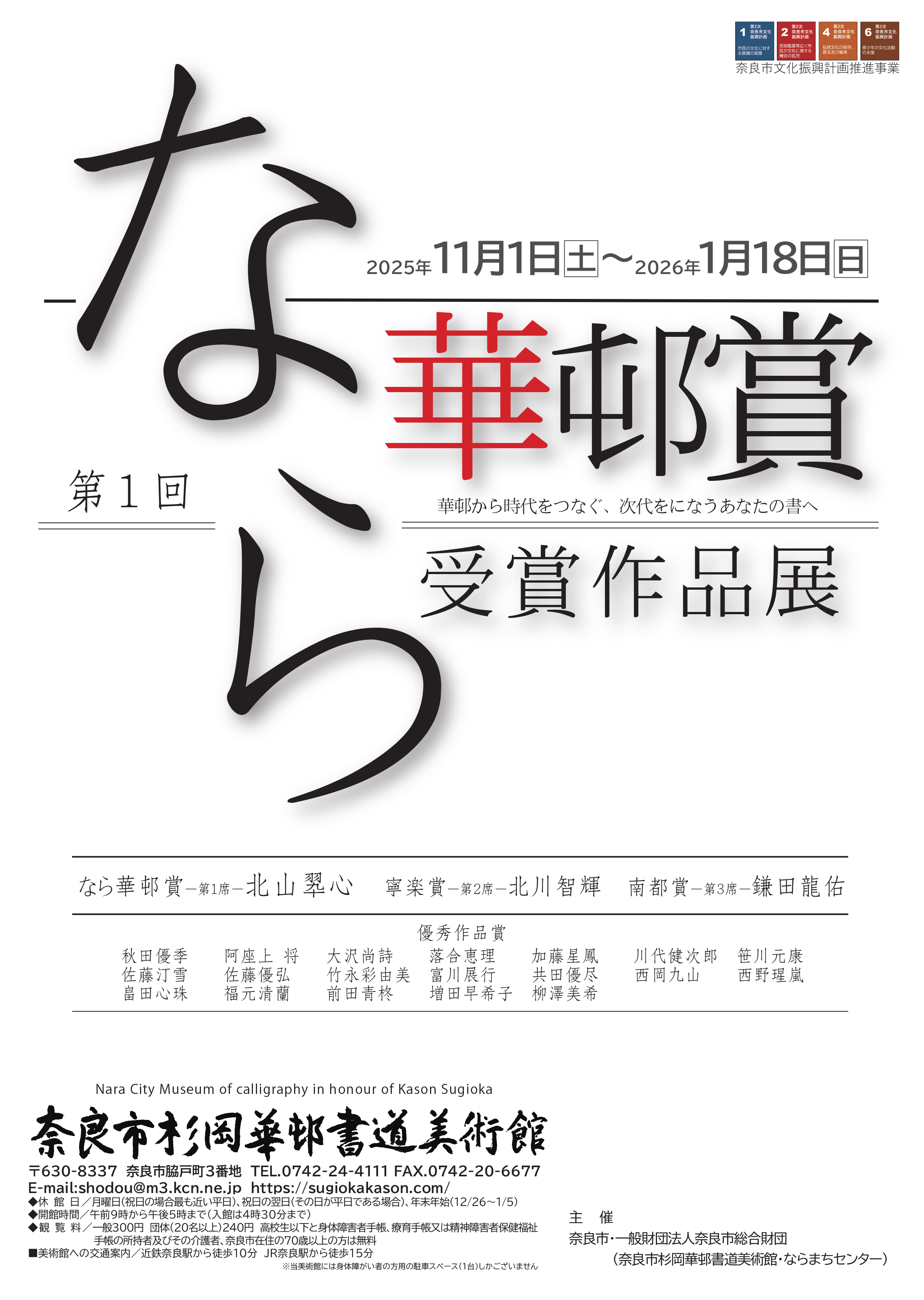 奈良市杉岡華邨書道美術館は、当時文化功労者で2000年秋に文化勲章を受章された杉岡華邨氏より、奈良市が作品の寄贈を受けたのを機に、氏の功績を称え貴重な作品を永く後世に伝えるとともに、書道の発展に寄与するため、2000年8月4日に開館した書道専門の美術館です。ユネスコの世界遺産にも登録された元興寺の旧境内に広がる「ならまち」の古い町並みに溶け込んだ落ち着いた白い建物が目印です。